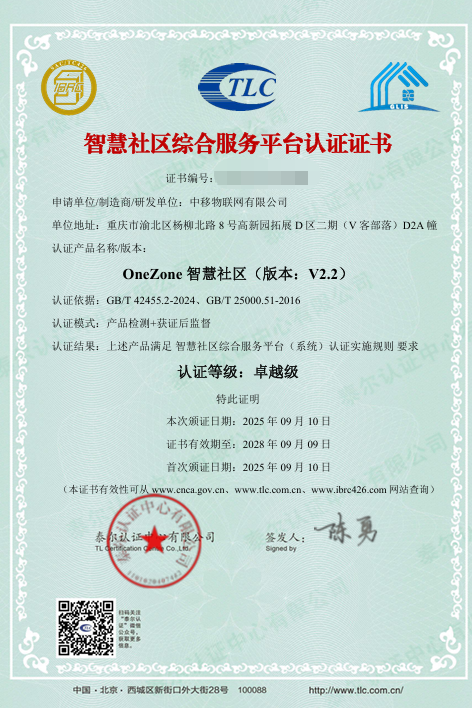 中移物联网“OneZone智慧社区(版本:V2.2)”评为卓越级智慧社区综合服务平台认证