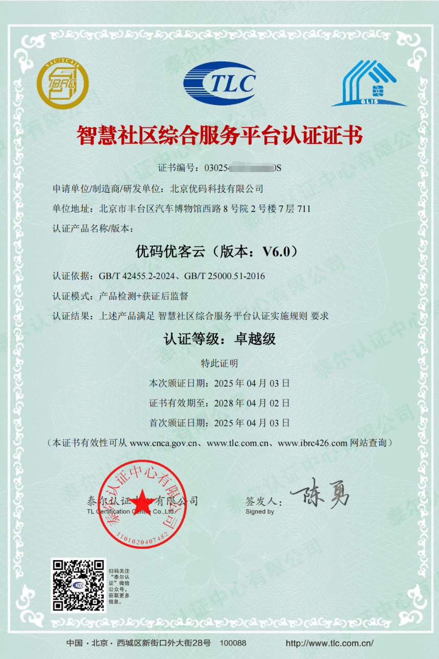 北京优码科技“优码优客云(版本:V6.0)”评为卓越级智慧社区综合服务平台认证